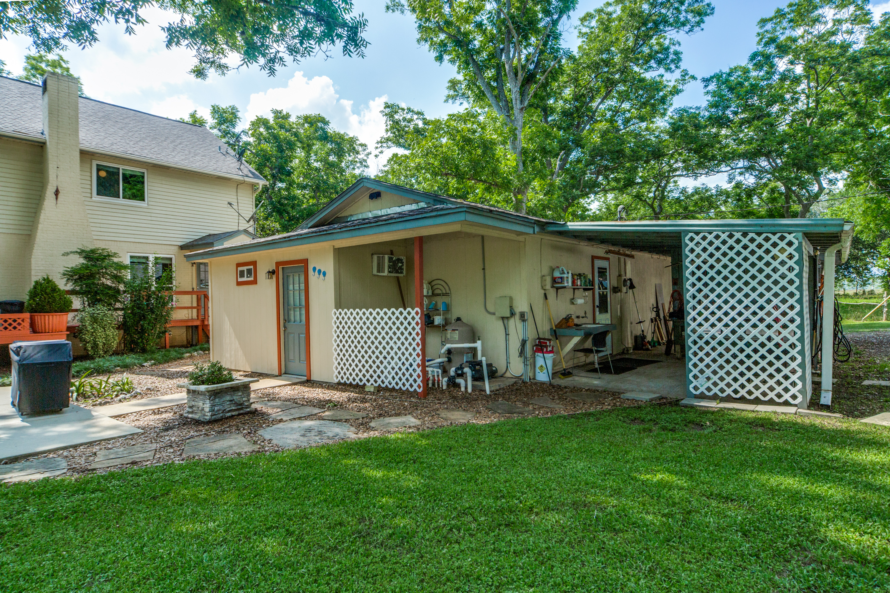 Captivating Victorian style home on ~1.8 acres nestled among 28 pecan trees and 2 oak trees at the end of this road on a cul de sac. Enjoy the beautiful scenery, the wildlife, the peace and tranquility of living out of the hustle and bustle and yet 20 min from Sugarland and 15 min from Rosenberg. Spacious bedrooms, living room, and family room. House has many details such as, wrap around front porch, pecan customized wood work downstairs, a laundry shoot upstairs to the inside laundry room downstairs, walk-in closets in all bedrooms, A wet bar, 2 spacious full baths upstairs with a half bath downstairs. Property has plenty of room to run, play, and grow. Barn or stables with tack room for horses or other animals. Circle drive in front and more parking in the back. A free-standing office building for work or creative pursuits. Fenced pool area to cool off and relax in, with its own designated full bathroom. Sitting area by the pool to relax or entertain guests. Endless possibilities.